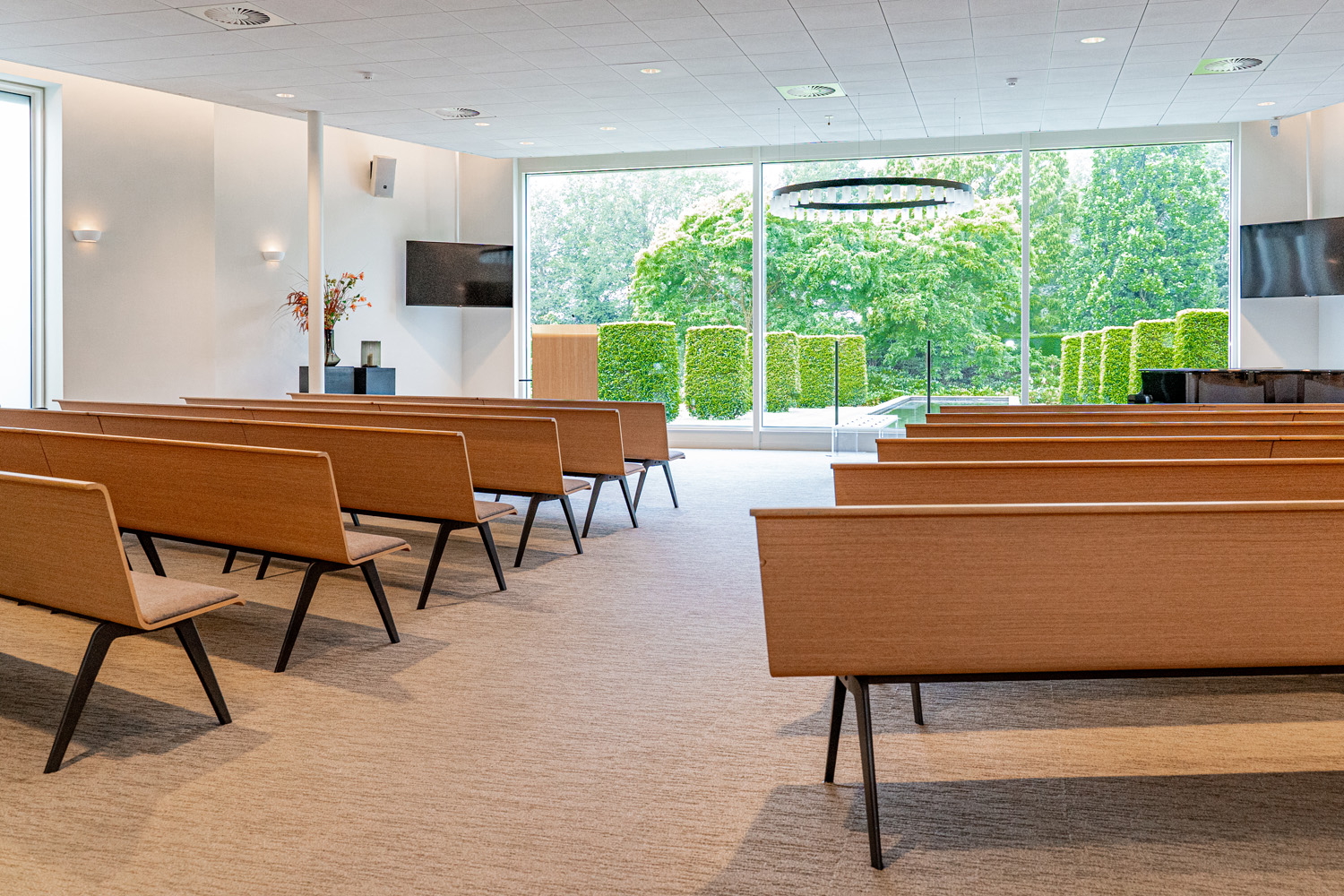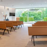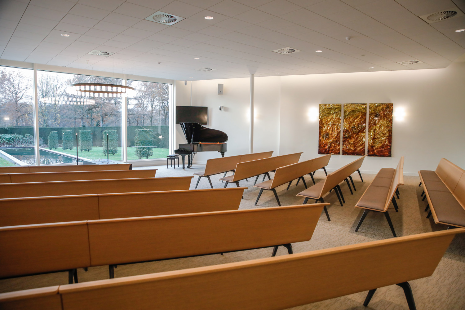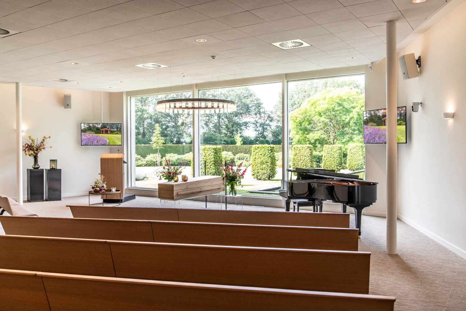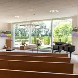 In der Aula ist der schöne Blick auf den charakteristischen Teich ein markantes Merkmal. Diese natürliche Verbindung nach draußen schafft Ruhe und Weite. Bild und Ton verleihen der Trauerfeier einen persönlichen und bedeutungsvollen Charakter; hierfür stehen uns sowohl die entsprechende Technik als auch ein Flügel zur Verfügung. In dieser Aula gibt es viele Möglichkeiten für Gruppen bis zu 130 Personen; dies gilt insbesondere in Kombination mit dem stimmungsvoll eingerichteten Gästezimmer. Innen und Außen verschmelzen in diesem Raum durch die große Glaswand mit Blick auf den Garten. Die angrenzende Terrasse bietet Raum, um auch im Grünen miteinander zusammenzukommen.