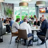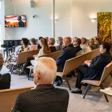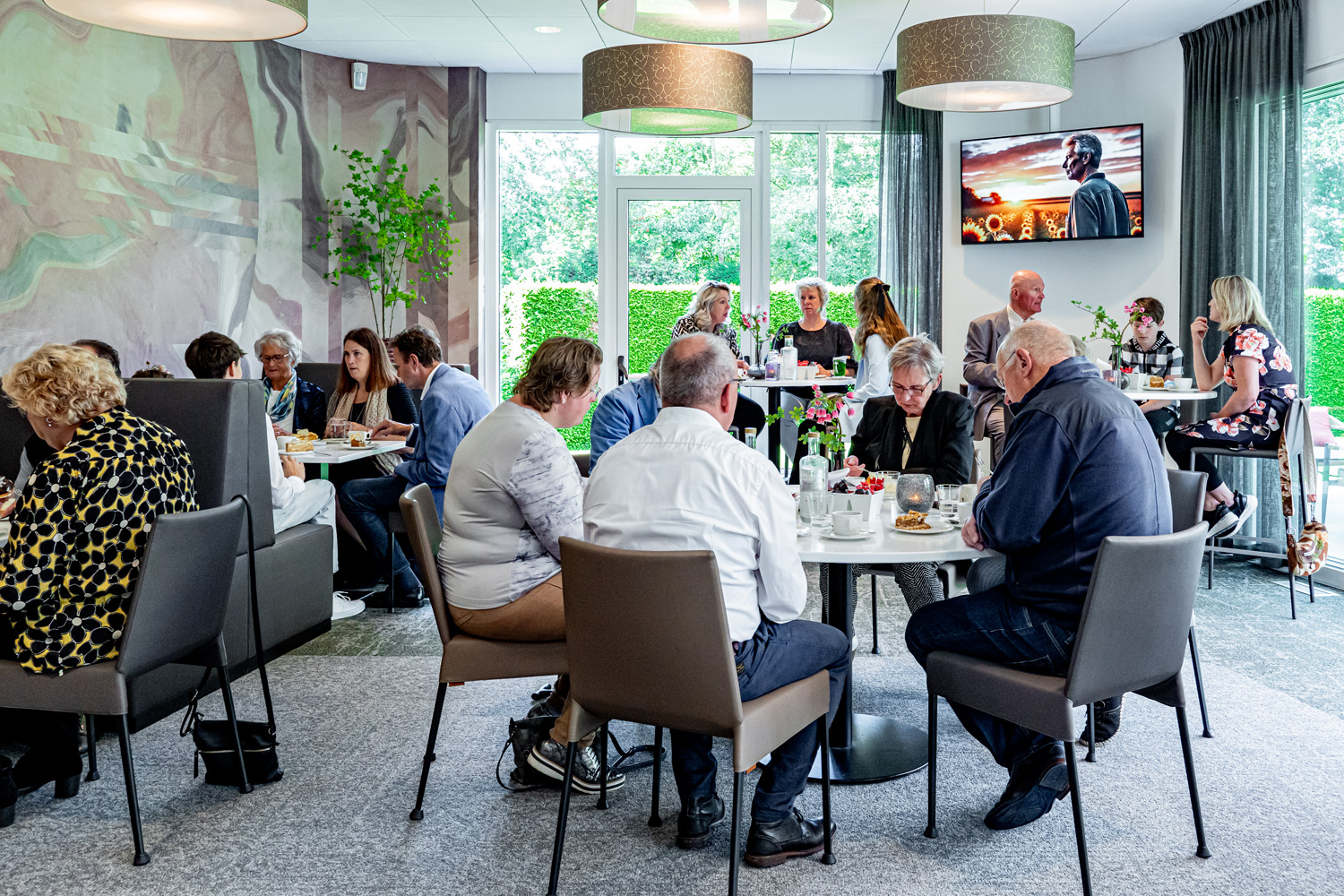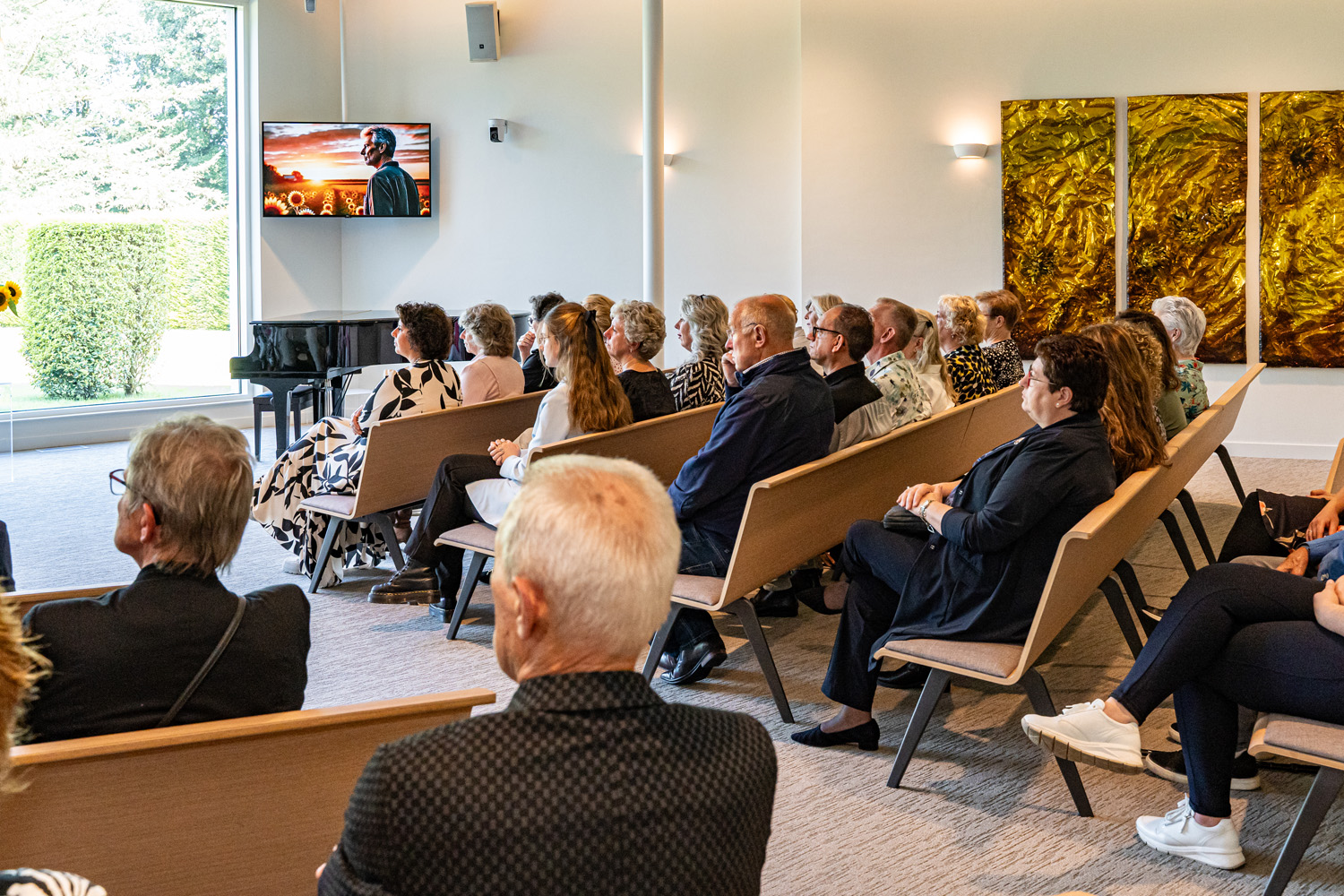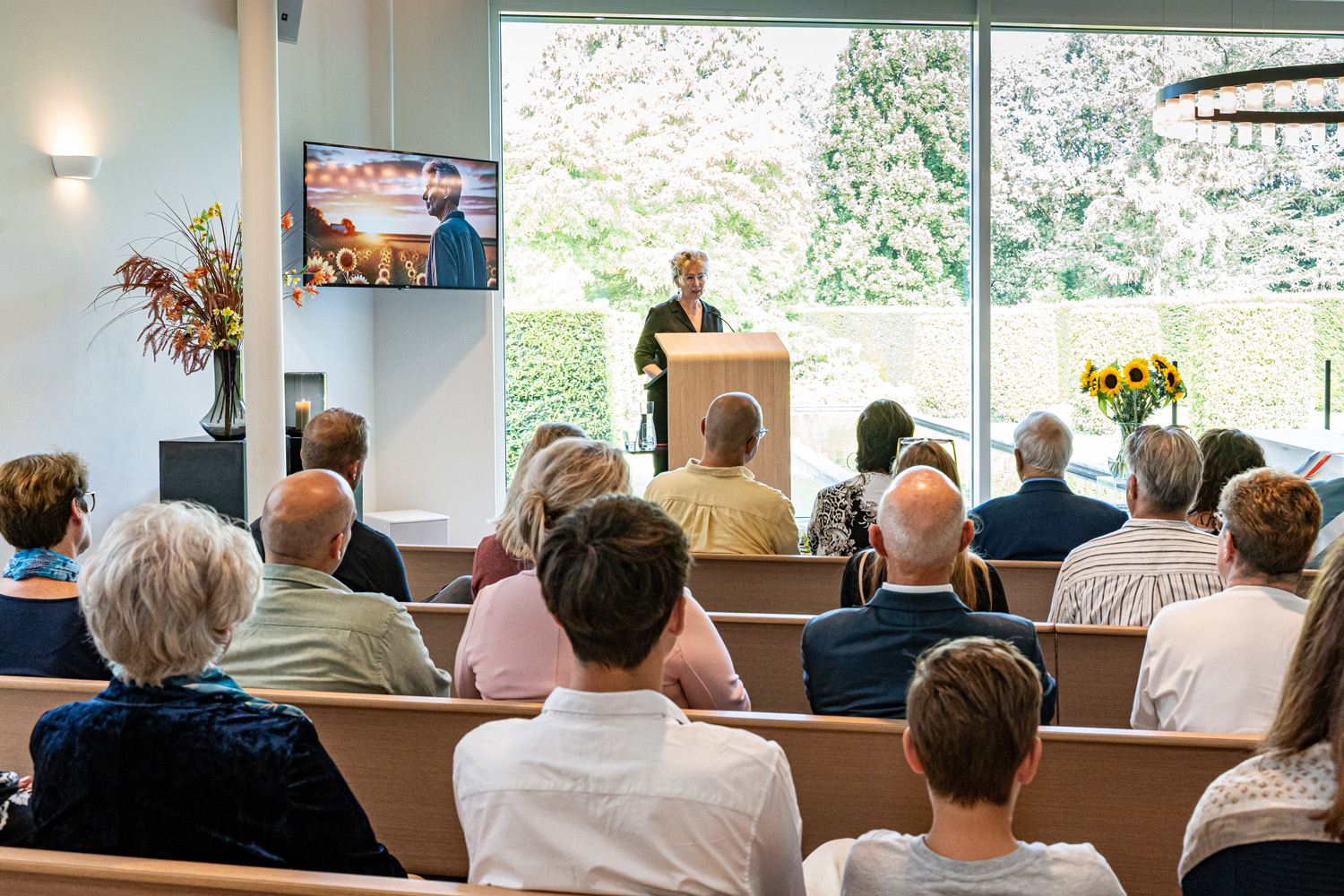 In der Aula ist der schöne Blick auf den charakteristischen Teich ein markantes Merkmal. Diese natürliche Verbindung nach draußen schafft Ruhe und Weite. Bild und Ton verleihen der Trauerfeier einen persönlichen und bedeutungsvollen Charakter; hierfür stehen uns sowohl die entsprechende Technik als auch ein Flügel zur Verfügung. In dieser Aula gibt es viele Möglichkeiten für Gruppen bis zu 130 Personen; dies gilt insbesondere in Kombination mit dem stimmungsvoll eingerichteten Gästezimmer. Innen und Außen verschmelzen in diesem Raum durch die große Glaswand mit Blick auf den Garten. Die angrenzende Terrasse bietet Raum, um auch im Grünen miteinander zusammenzukommen.