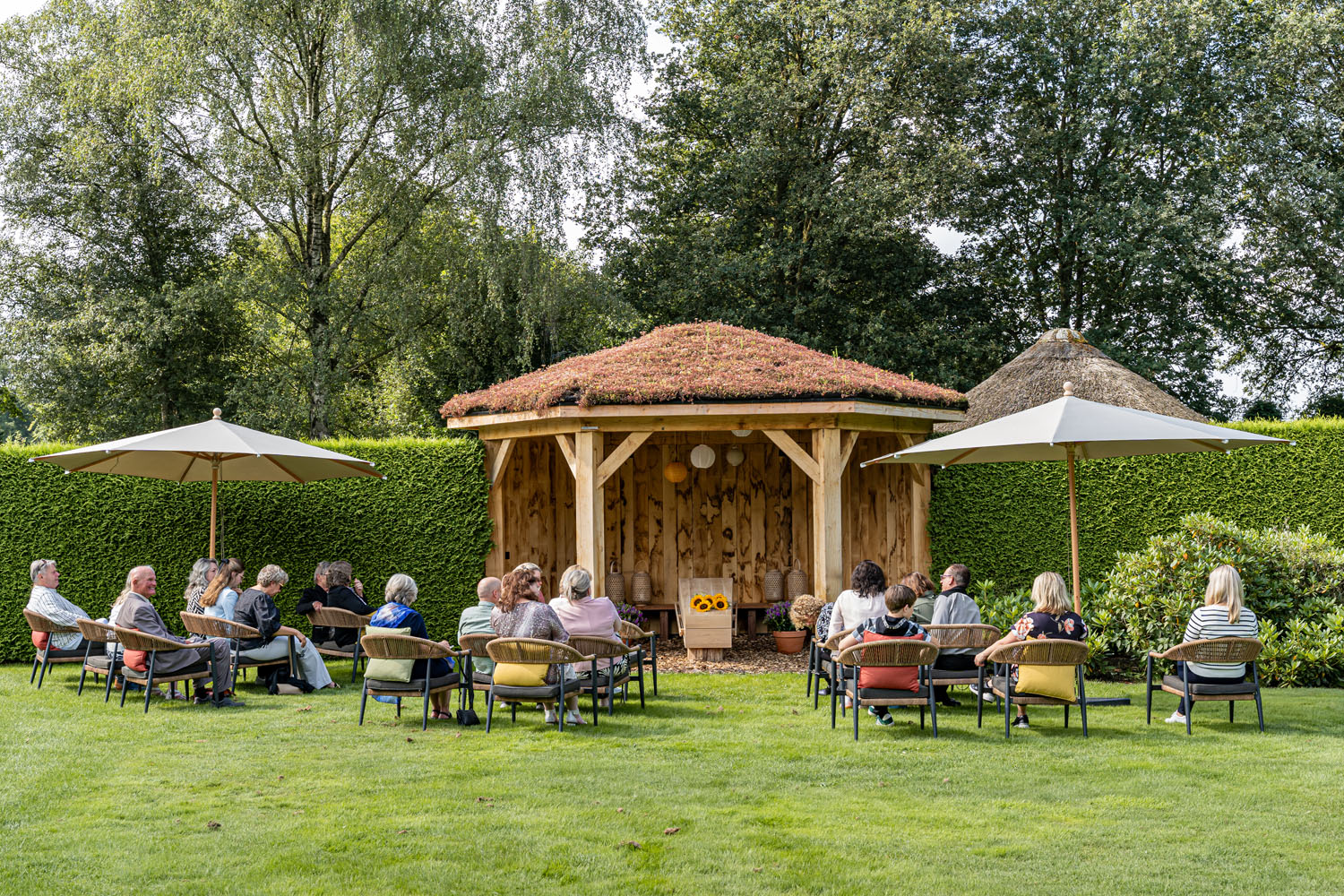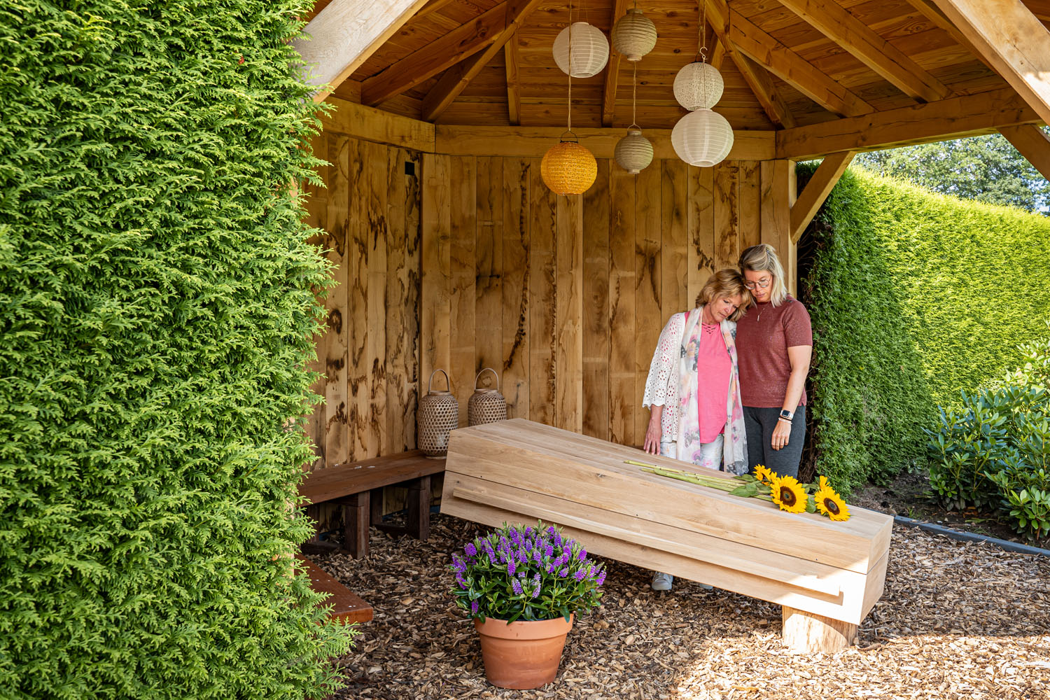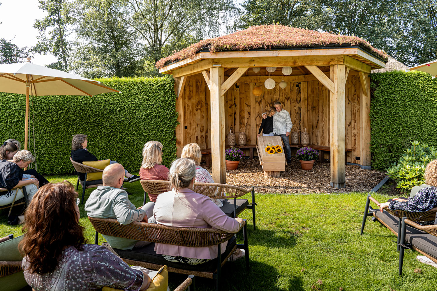 Im Krematorium Almelo Sie die Möglichkeit, die Trauerfeier im Freien abzuhalten. Eine Trauerfeier im naturbelassenen Garten dieses Standorts schafft eine andere Atmosphäre als drinnen. Sie ist ungezwungener, und die Gäste empfinden sie oft als beruhigend und persönlich. Wir beraten Sie gerne zu den verschiedenen Möglichkeiten.